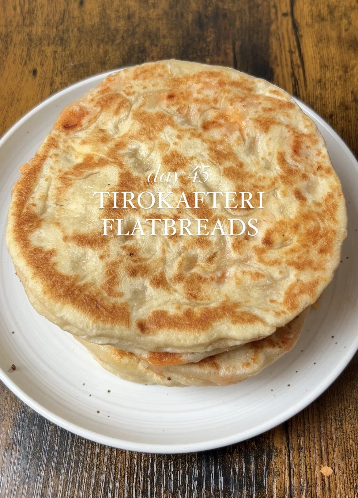 Flatten each ball with your hands and stuff each one roughly with a teaspoon of the Tirokafteri. Pinch the corners of the dough to the middle and pinch to close the dough from spilling. Carefully flatten with a rolling pin to form the flatbread shapes and using your fingertips, create dimples in the dough.