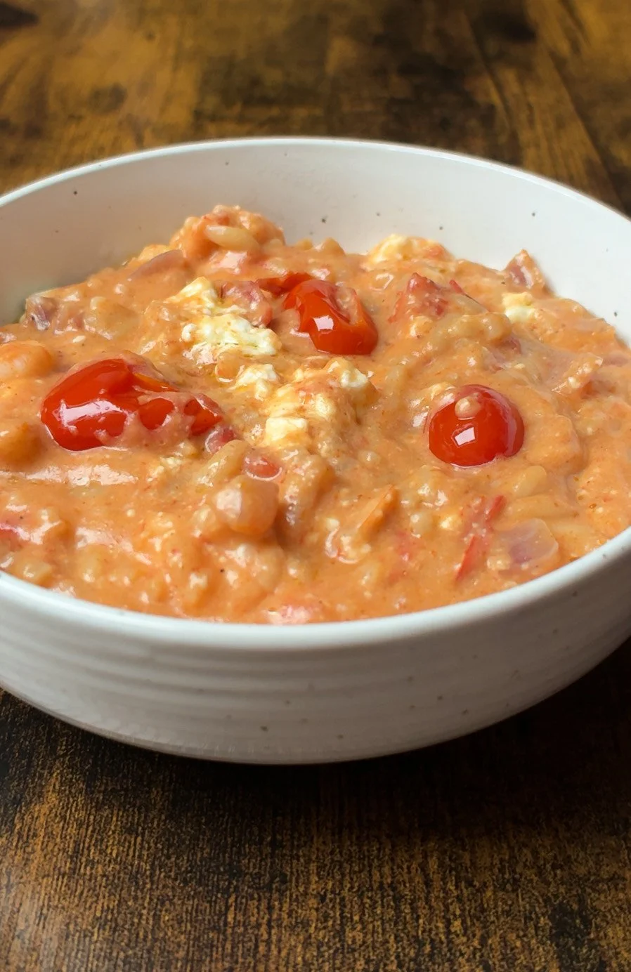 We’re talking orzo simmered in rich chopped tomatoes, smoky paprika, a hint of chilli, and a secret creamy base made from blitzed cottage cheese (trust me on this one ). It’s then crowned with crumbled feta (because obviously) and finished with that signature drizzle of liquid gold olive oil.